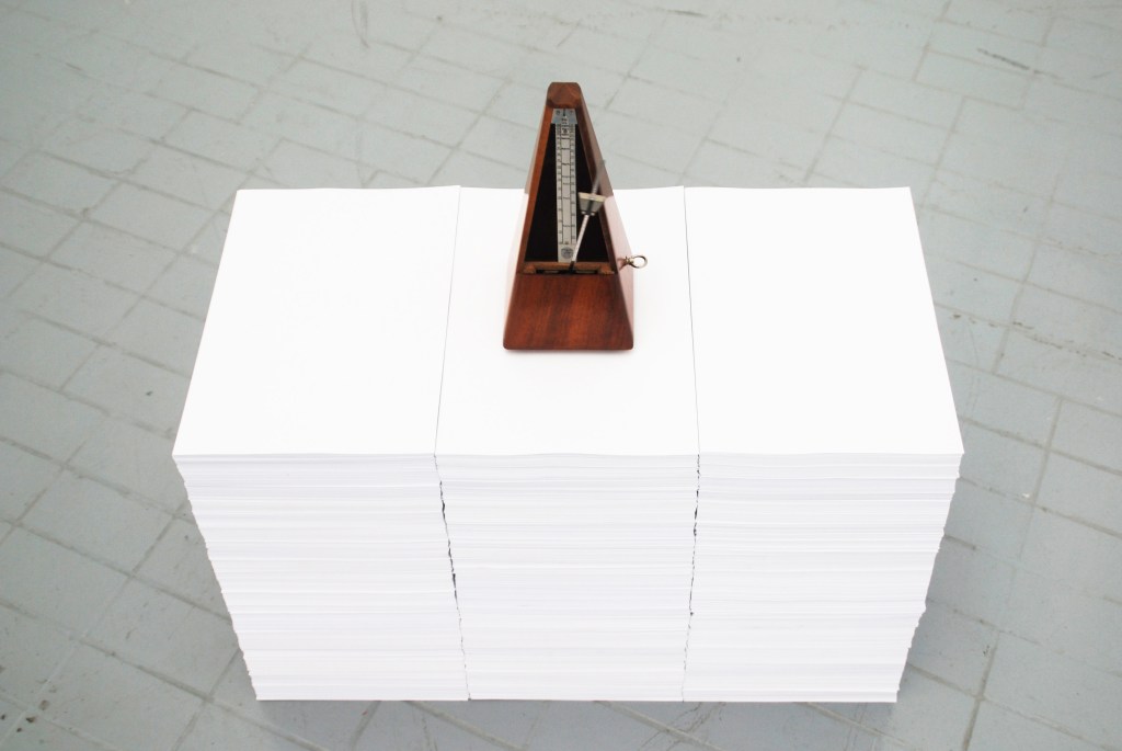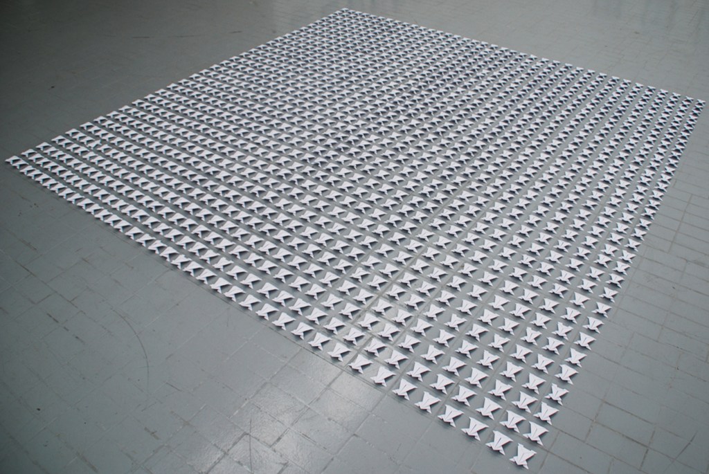10 000 papier A4, 2009-2018Après comptage de plusieurs ramettes de papier, j'ai constaté une marge d'erreur de plus ou moins deux feuilles dans le conditionnement des ramettes de 500 feuilles A4 vendue en grande distribution. J'ai donc décidé de constituer manuellement un tas de 10000 feuilles sans étalonnage. Nait alors une compétition entre l'homme et la machine. A qui faire confiance? Qui est légitime? Je pose ici la question du remplacement de l'homme par la machine qui est en marche! Ainsi est soulevé la problématique du travail à la chaine, de l'industrialisation de masse, la modernisation et de la spéculation...