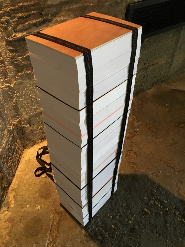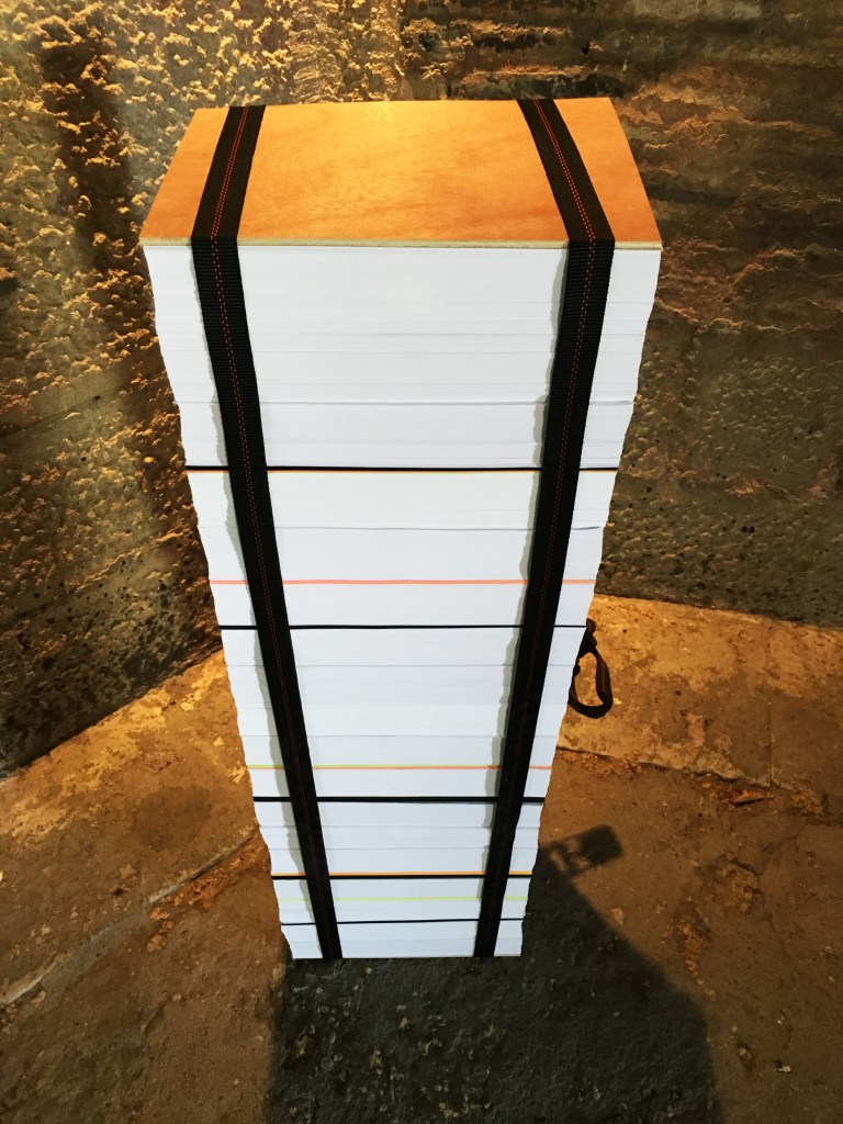 1707 papier A4, sangles, contreplaqué, 2016Oeuvre crée à l'occasion d'une exposition au sein d'une tour Vauban édifiée en 1707 (classée au patrimoine mondial de l'Unesco), cette tour de papier se compose de 17 070 feuilles A4 empilées comme diverses couches en chronostratigraphie. L'ensemble vient symboliser une carotte (échantillon obtenu lors de forage d'exploration). Les sangles de chantier viennent fixer l'œuvre tout en lui laissant l'instabilité et la fragilité de l'architecture qui la reçoit. le choix des feuilles de couleurs sont un clin d'oeil au code utilisé sur les "résistances" en électronique.