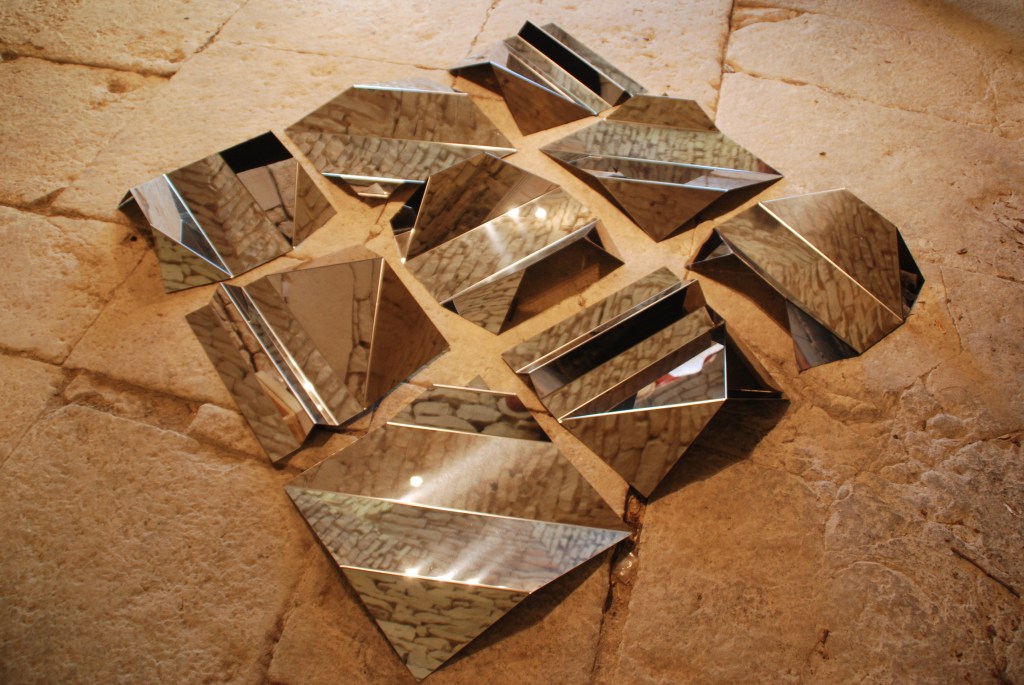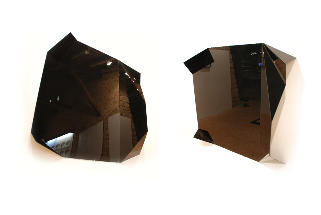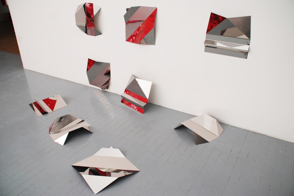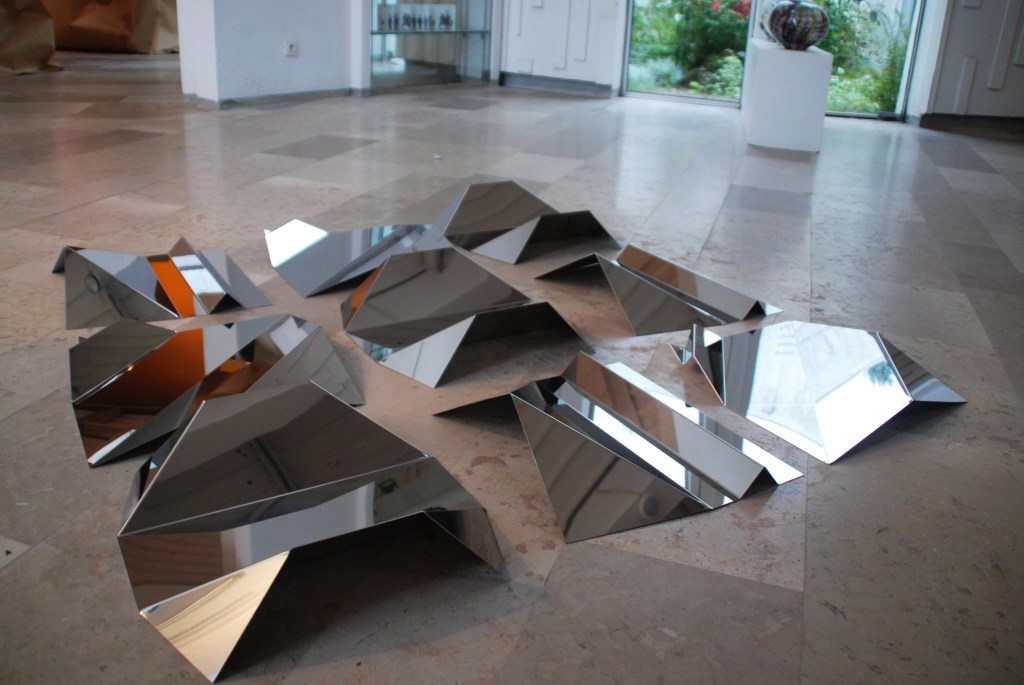 xperimental Folding inox poli miroir ou plexiglass, taille variable, 2011-2017"tout se plie, se déplie, se replie" G.Deleuze. Le pli est une réalité purement optique, c'est comme le pli au hasard dans la peinture du XVII ème siècle, c'est comme le pli-trait qui n'est plus du tout un pli-ligne. Chez les Grecs c'est encore une ligne harmonique. En Égypte c'est la légalité cristalline géométrique. Ici la pièce vient détruire sont habitat pour que chaque témoin de la l'oeuvre vienne construire la pièce et sont environnement.