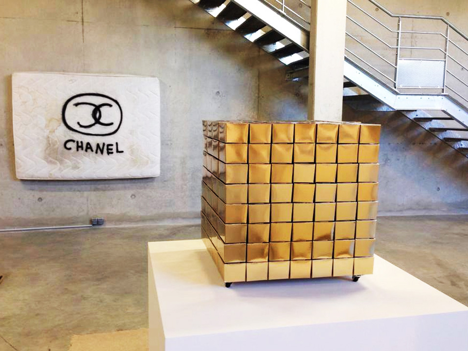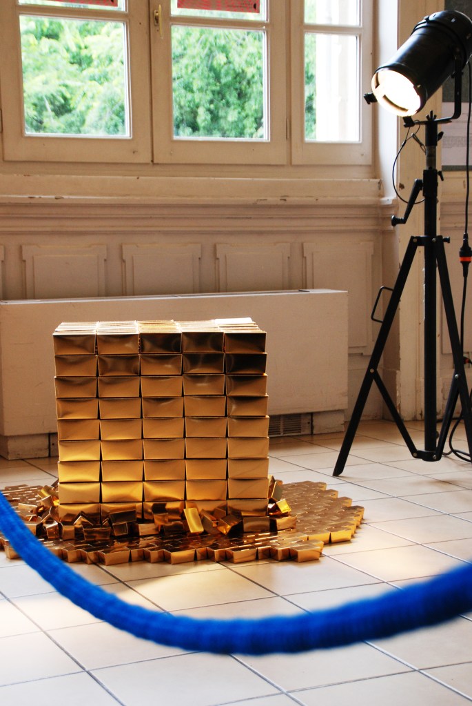 450/--- ballotins de chocolats, contreplaqué, roulettes, 2010-2015Nous faisons de l'or le signe du luxe depuis la naissance des premières cités humaines jusqu'aux bourses financières d'aujourd'hui. Mais ce métal semble bien léger face aux vicissitudes de la vie qu'il ne saurait combler malgré tout son éclat. L'or est de carton. Et méfiez vous des apparences!