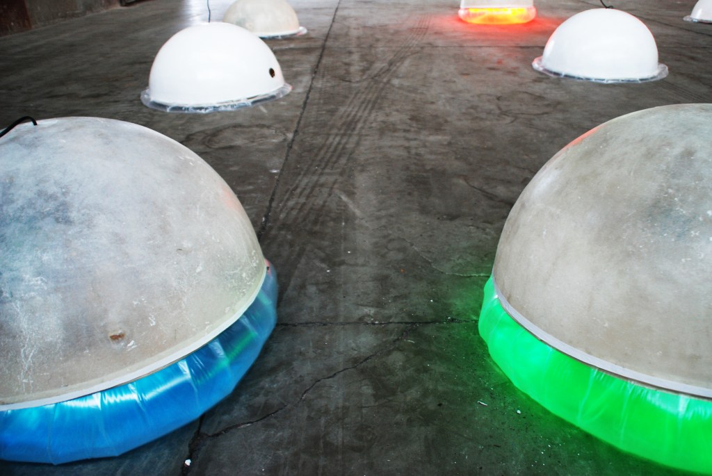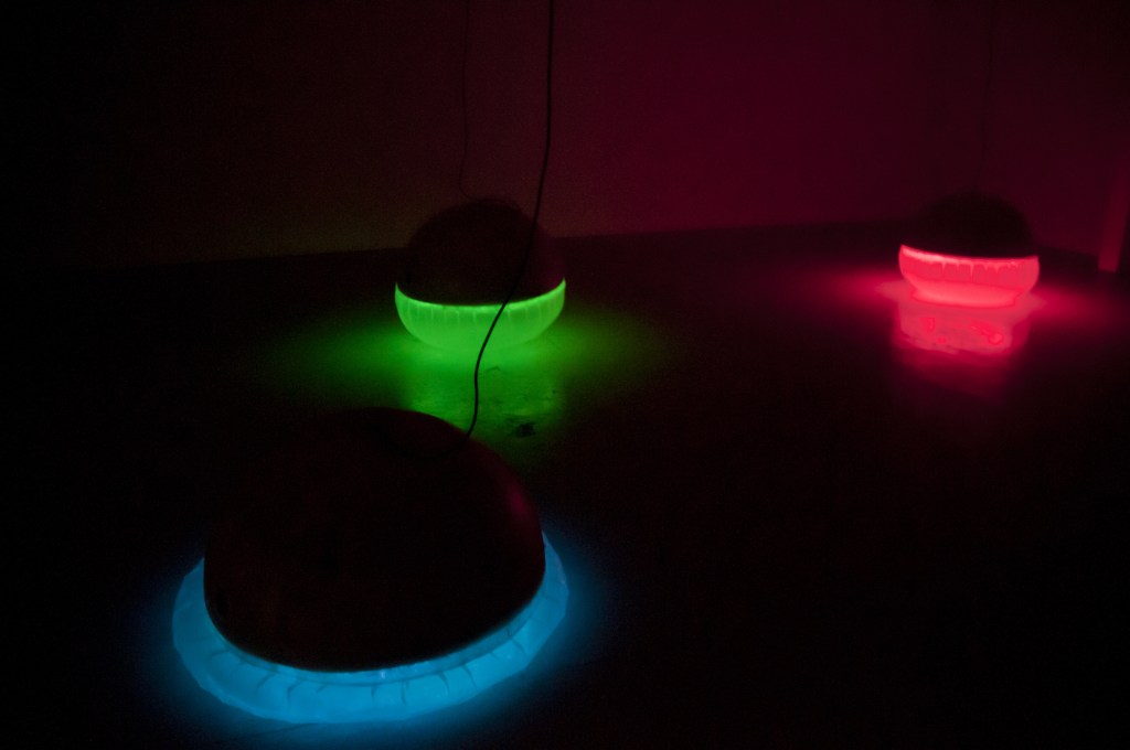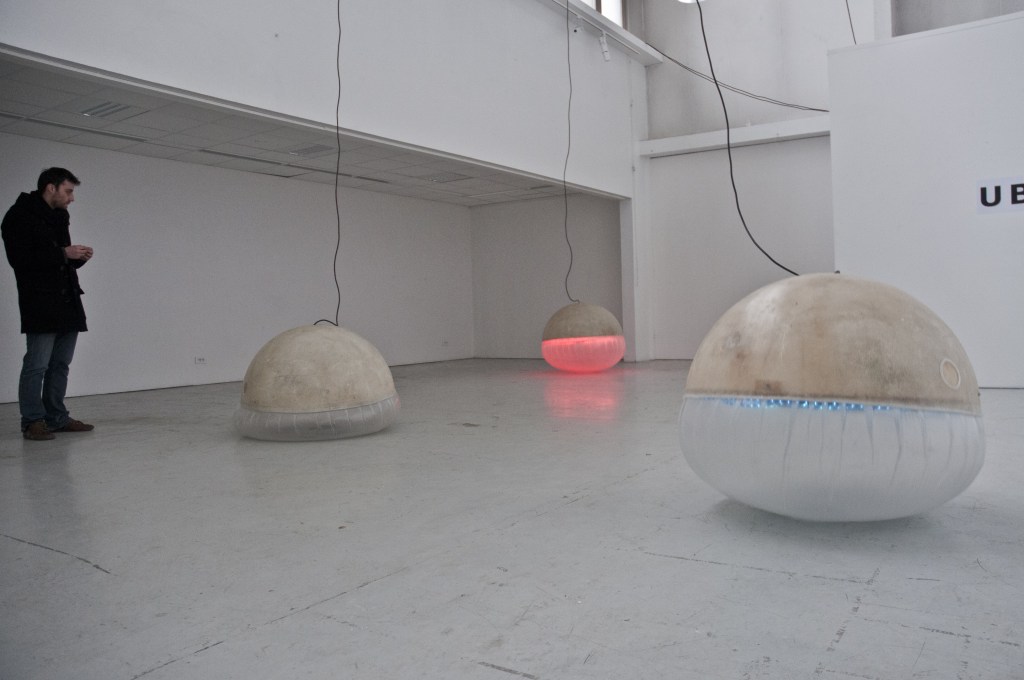 UBB3 & UGB9, "collectif Track Now" Raspberry pi, cables RG45, Souffleur, fibre de verre, silicone, LED, 2018Cette pièce peut-être autonome comme elle peut-être interactive. Des fois fonctionnelle par le fruit d’un hasard informatique (fatalité d’un logiciel) et d’autre fois par les désirs de ses spectateurs (via un QR code et un smart phone). Né de l’assemblage technique d’objets du quotidien, l’oeuvre donne l’illusion d’un monde apocalyptique assumé et rebondissant. Une sculpture qui par son volume sonore, ses couleurs lumineuses et ses mouvements perpétuels vient régner sur l’espace qu’elle habite.