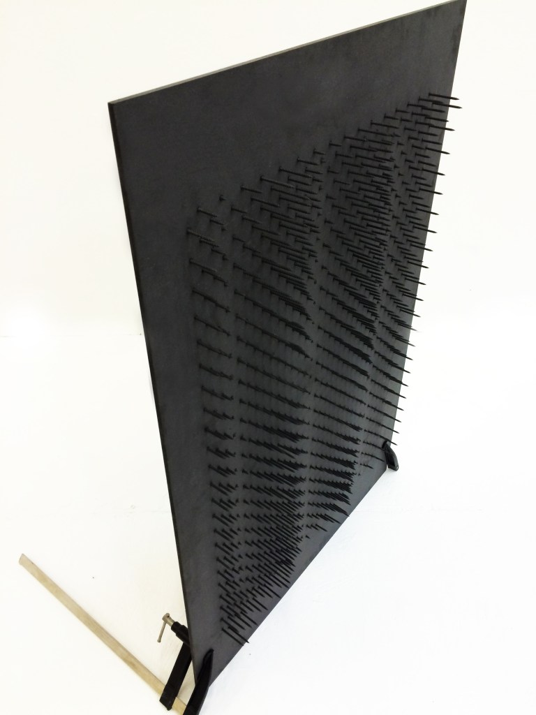 "Black Hole", MDF, Vis, 2016Black hole est modulable, évolutive. Chaque propositions peut être éphémères. Je propose un support sculptural qui invite a être modifié à l’image de la société qui est en perpétuelle transformation. C’est une oeuvre faite de consommables pauvres qui engagent au mouvement permanent, c’est un jeux pour adulte. L’œuvre soulève la question du pouvoir de l'objet manufacturé sur l’homme.